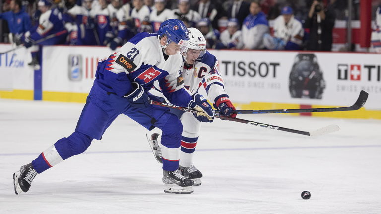 Slovenský kapitán Šimon Nemec a Američan Cutter Gauthier počas zápasu B-skupiny na MS v hokeji do 20 rokov. Moncton (Avenir Centre), 28. december 2022. Foto: Ron Ward/The Canadian Press via AP.