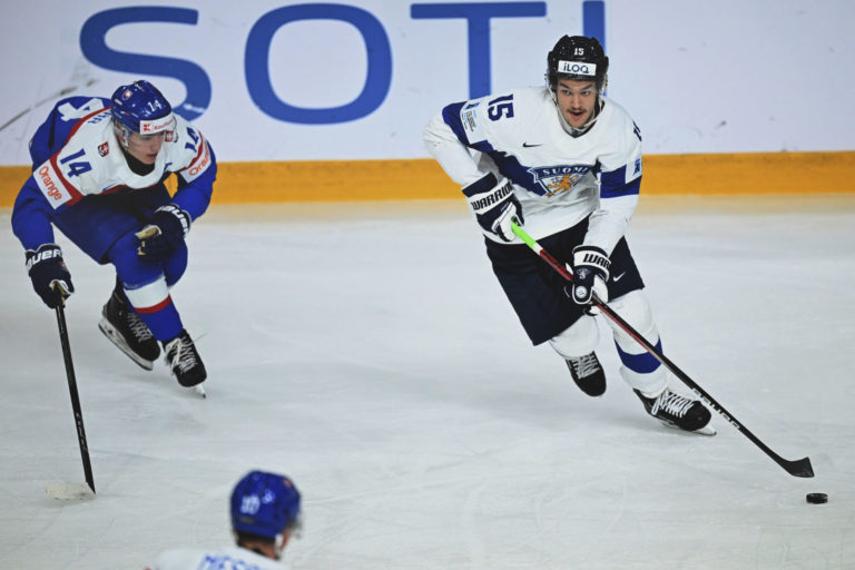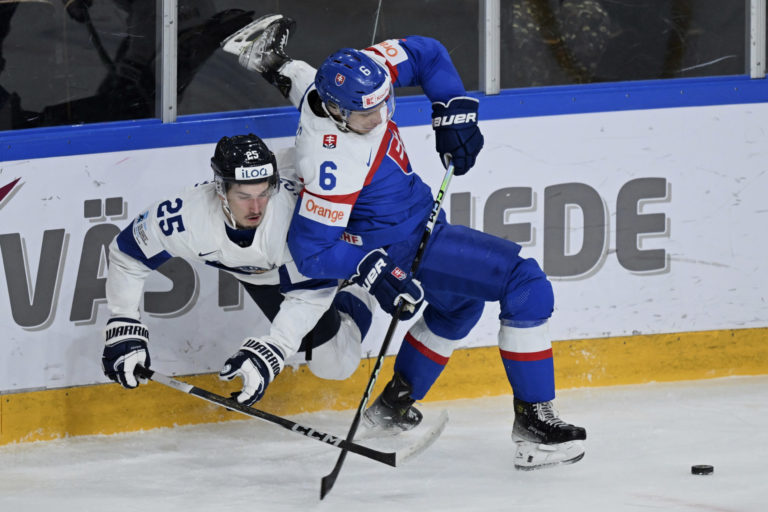 Útočník Adam Sýkora a Fín Konsta Helenius počas štvrťfinálového zápasu na MS v hokeji do 20 rokov. Göteborg, 2. január 2024. Foto: Bjoern Larsson Rosvall/TT News Agency via AP.
