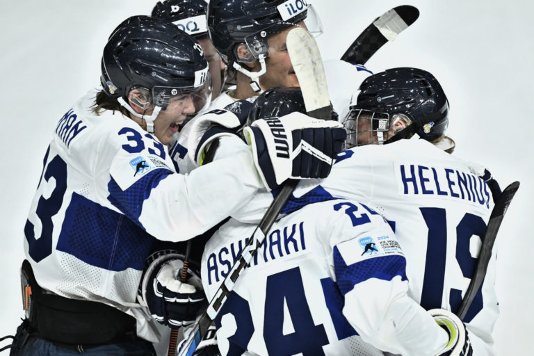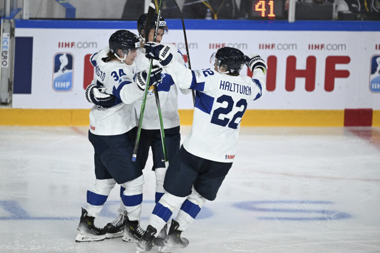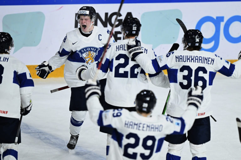 Fínsky útočník Aleksantari Kaskimäki sa so spoluhráčmi teší zo svojho gólu v sieti Slovenska vo štvrťfinálovom zápase na MS v hokeji do 20 rokov. Göteborg, 2. január 2024. Foto: Bjoern Larsson Rosvall/TT News Agency via AP.