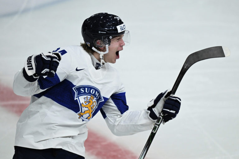 Fínsky útočník Tommi Männistö sa teší zo svojho gólu v sieti Slovenska počas štvrťfinálového zápasu na MS v hokeji do 20 rokov. Göteborg, 2. január 2024. Foto: Bjoern Larsson Rosvall/TT News Agency via AP.