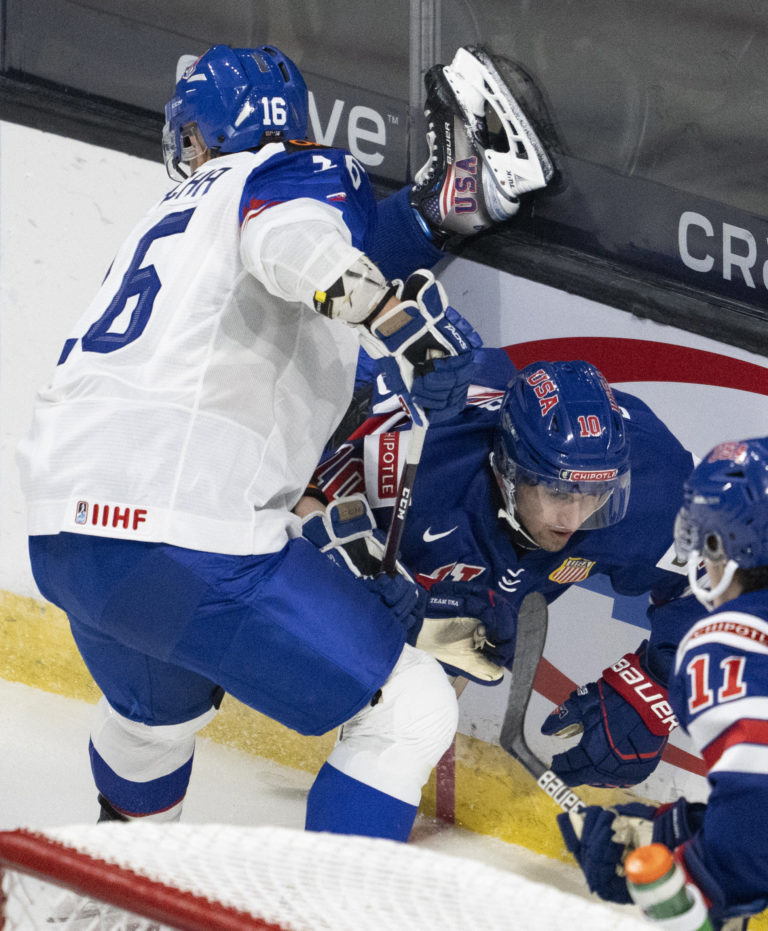 Američan Dominic James (16) padá po súboji so slovenským útočníkom Jurajom Slafkovským počas zápasu na MS v hokeji do 20 rokov. Red Deer (Westerner Park Centrium), 26. december 2021. Foto: archívne, Jonathan Hayward/The Canadian Press via AP.