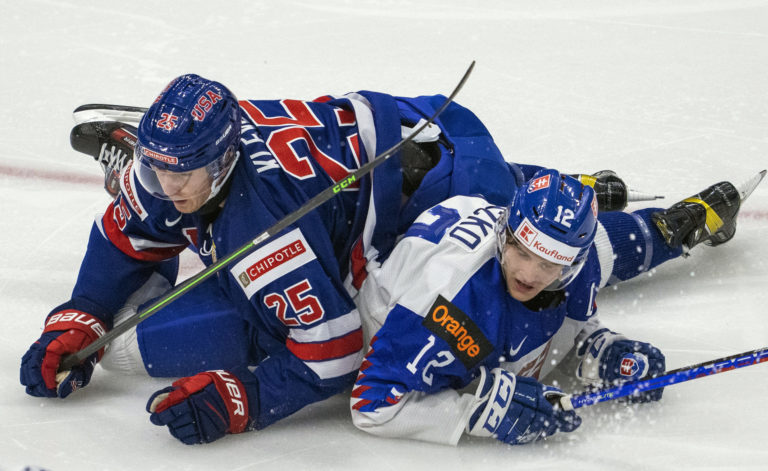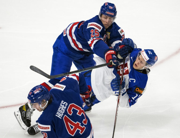 Slovenský útočník Samuel Kňažko padá po súboji s Američanom Tylerom Klevenom (25) počas zápasu na MS v hokeji do 20 rokov. Red Deer (Westerner Park Centrium), 26. december 2021. Foto: Jonathan Hayward/The Canadian Press via AP.