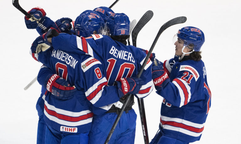 Americký útočník Mackie Samoskevich (11) sa so spoluhráčmi teší zo svojho gólu v sieti Slovenska počas zápasu na MS v hokeji do 20 rokov. Red Deer (Westerner Park Centrium), 26. december 2021. Foto: Jonathan Hayward/The Canadian Press via AP.