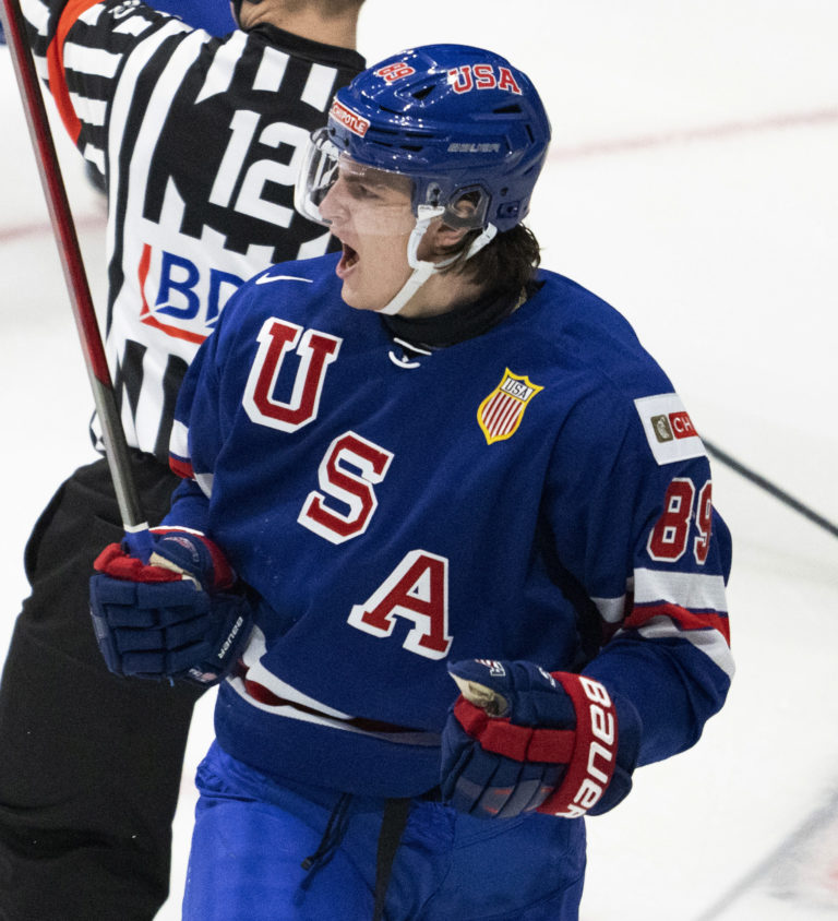 Američan Matthew Knies (89) sa teší z gólu v sieti Slovenska počas zápasu na MS v hokeji do 20 rokov. Red Deer (Westerner Park Centrium), 26. december 2021. Foto: Jonathan Hayward/The Canadian Press via AP.