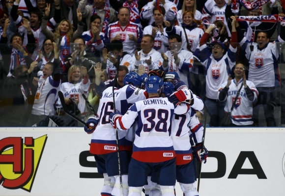 Radosť hráčov Slovenska po strelení gólu počas zápasu základnej A skupiny Rusko - Slovensko na 75. hokejových majstrovstvách sveta 2011 IIHF v Bratislave. Bratislava, 3. máj 2011. Foto: SITA/Jozef Jakubčo