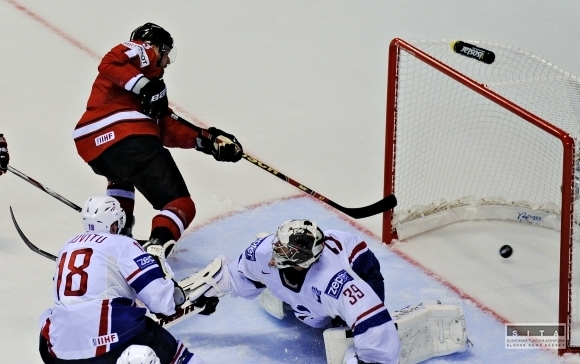 Julien Vauclair zo Švajčiarska (v červenom) strieľa rozhodujúci gól do bránky francúzskeho brankára Cristobala Hueta počas zápasu Švajčiarsko - Francúzsko základnej B - skupiny na 75. hokejových majstrovstvách sveta 2011 IIHF v Košiciach. Košice, 29. apríl 2011. Foto: SITA/Ivan Fleischer