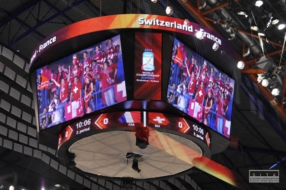 Informačná kocka v Steel Aréne počas zápasu Švajčiarsko - Francúzsko základnej skupiny na 75. hokejových majstrovstvách sveta 2011 IIHF v Košiciach. Košice, 29. apríl 2011. Foto: SITA/Ivan Fleischer