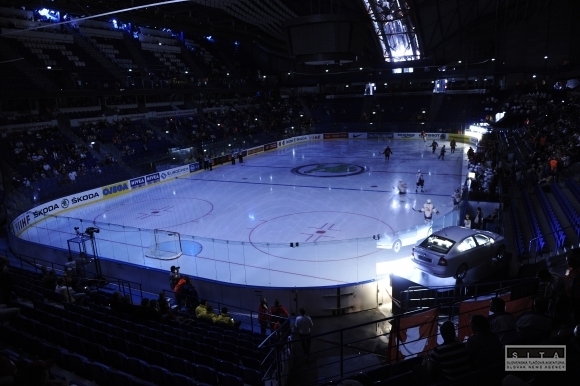 Výpadok elektriny v Steel Aréne počas zápasu Švajčiarsko - Francúzsko základnej skupiny na 75. hokejových majstrovstvách sveta 2011 IIHF v Košiciach. Do arény prenikalo iba trochu denného svetla a ľadovú plochu osvetľovali reklamné podstavce pre autá Škoda vlastným napájaním. Košice, Bratislava, 29. apríl 2011. Foto: SITA/Ivan Fleischer