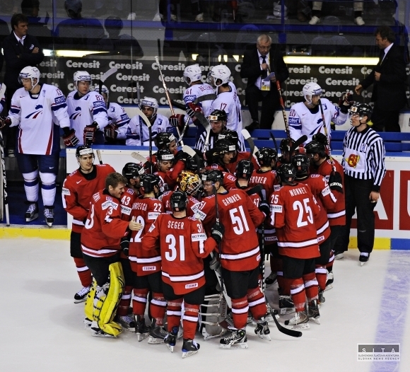 Švajčiari sa tešia z víťazstva, ktoré získali v predĺžení zápasu Švajčiarsko - Francúzsko základnej B - skupiny na 75. hokejových majstrovstvách sveta 2011 IIHF v Košiciach. Košice, 29. apríl 2011. Foto: SITA/Ivan Fleischer