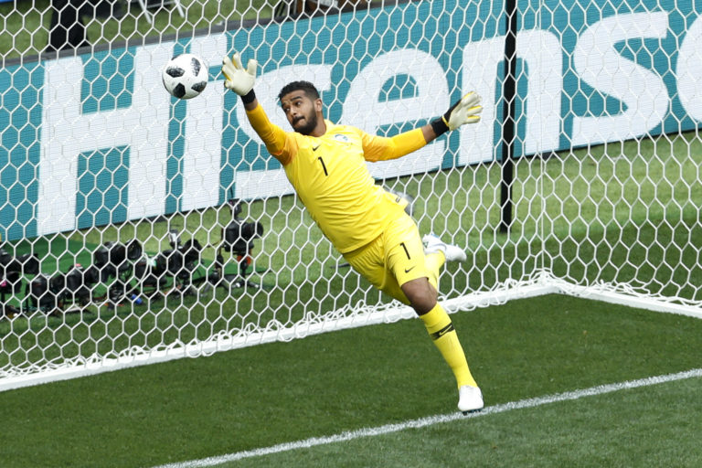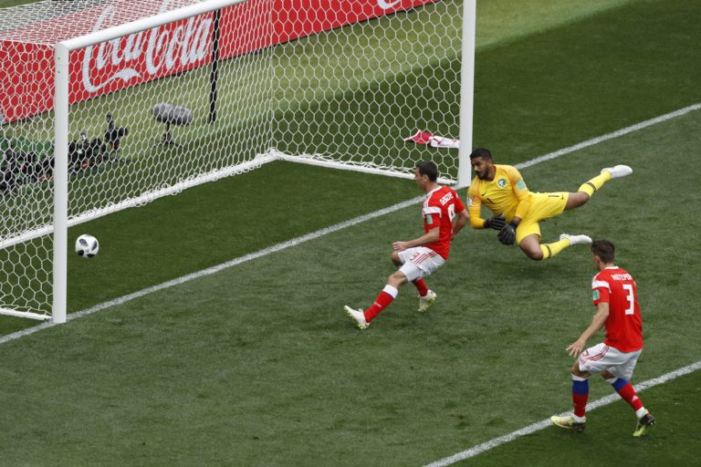 Lopta po zakončení ruského futbalistu Jurija Gazinského končí v sieti brankára Saudskej Arábie Abdullaha Almuaioufa počas zápasu na MS vo futbale 2018. Moskva, 14. jún 2018. Foto: SITA/AP