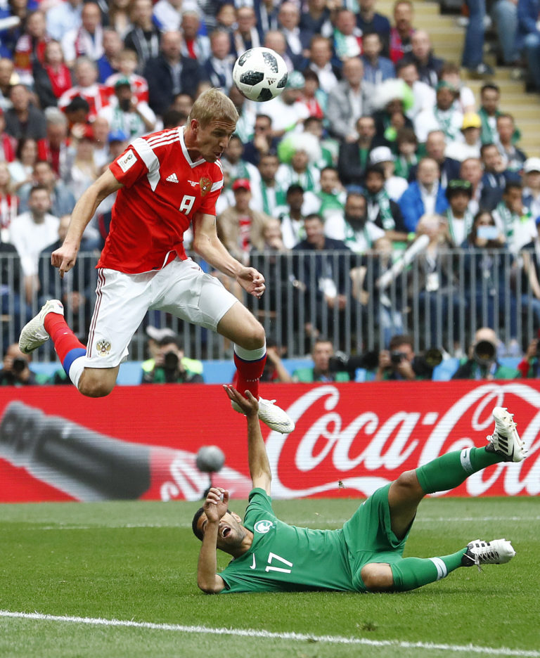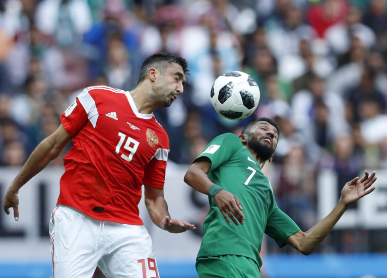 Hlavička Ruska Jurija Gazinského počas zápasu proti Saudskej Arábii na MS vo futbale 2018. Moskva, 14. jún 2018. Foto: SITA/AP.