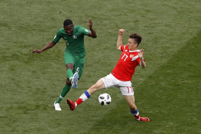 Rusk Alexander Golovin v súboji s futbalistom Saudskej Arábie Omarom Othmanom počas zápasu na MS vo futbale 2018. Moskva, 14. jún 2018. Foto: SITA/AP.