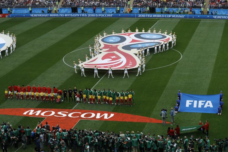 Slávnostný ceremoniál pred úvodným zápasom na MS vo futbale 2018 medzi Ruskom a Saudskou Arábiou. Moskva, 14. jún 2018, Foto: SITA/AP.