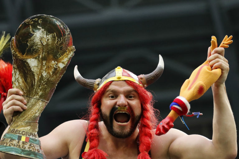 Fanúšik Belgicka fandí a skanduje počas zápasu na MS vo futbale 2018 v Rusku, 10. júl 2018. Foto: SITA/AP