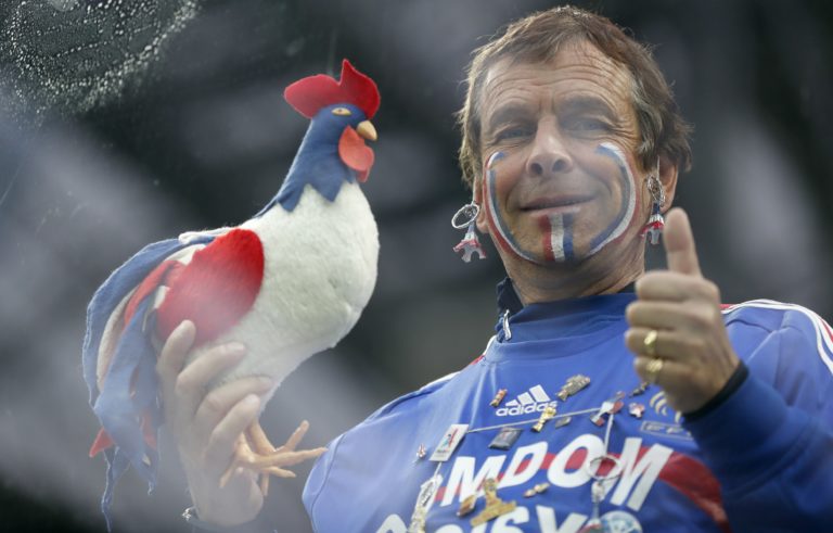 Francúzsky fanúšik dáva palec hore a fandí počas zápasu na MS vo futbale 2018 v Rusku, 10. júl 2018. Foto: SITA/AP