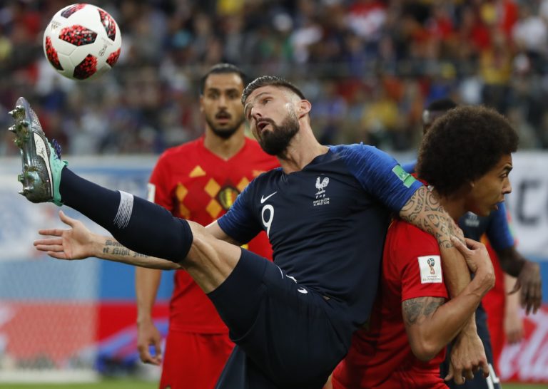 Zľava: Francúz Olivier Giroud a hráč Belgicka Axel Witsel v súboji o loptu v zápase na MS vo futbale 2018 v Rusku, 10. júl 2018. Foto: SITA/AP