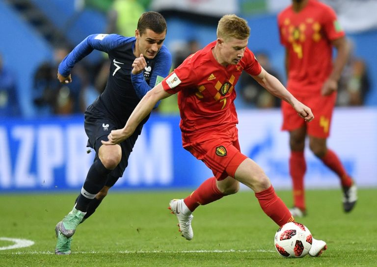 Zľava: Francúz Antoine Griezmann a Belgičan Kevin De Bruyne v súboji o loptu v zápase na MS vo futbale 2018 v Rusku, 10. júl 2018. Foto: SITA/AP