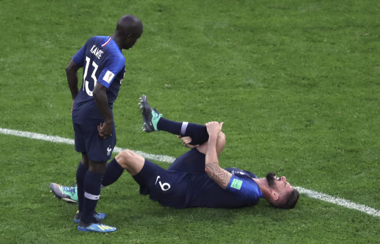 Francúz Olivier Giroud si drží nohu po zranení v zápase na MS vo futbale 2018 v Rusku, 10. júl 2018. Foto: SITA/AP