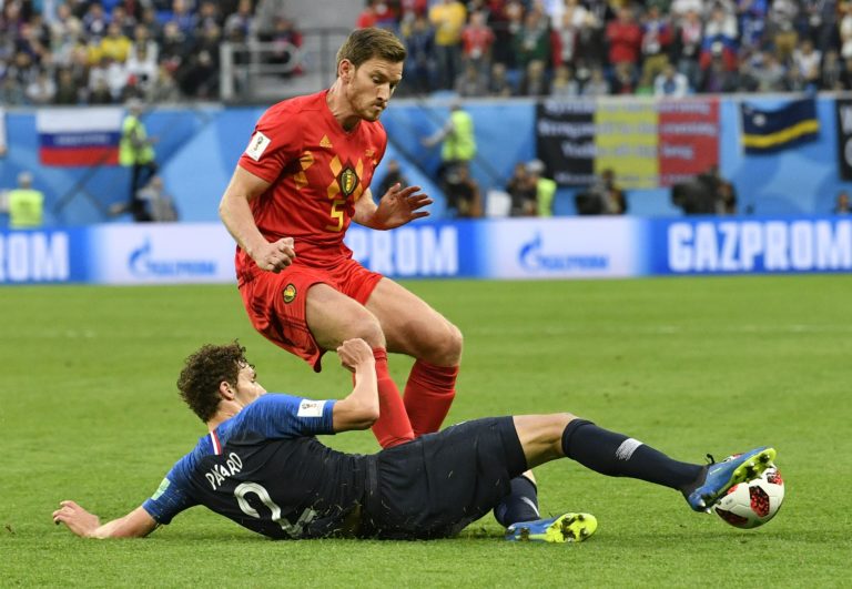 Francúz Benjamin Pavard (hore) a hráč Belgicka Jan Vertonghen v súboji o loptu v zápase na MS vo futbale 2018 v Rusku, 10. júl 2018. Foto: SITA/AP