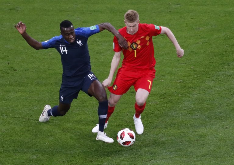 Zľava: Francúz Blaise Matuidi v súboji o loptu s Belgičanom Kevinom De Bruyneom v zápase na MS vo futbale 2018 v Rusku, 10. júl 2018. Foto: SITA/AP