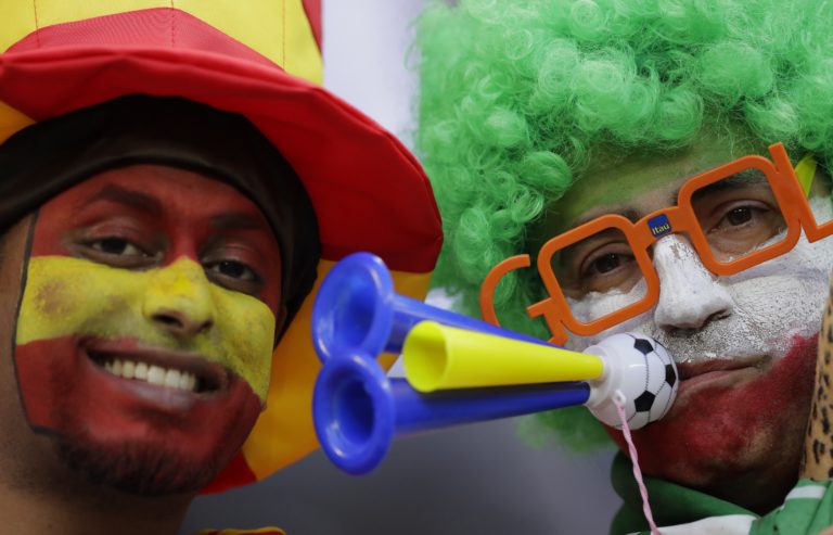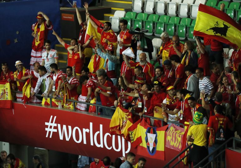 Španielski fanúšikovia oslavujú triumf svojho tímu, keď zdolali Irán 1-0 na MS vo futbale 2018 v Rusku, 20. júna 2018 Foto: SITA/AP