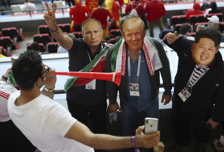Iránski fanúšikovia majú na tvári masky (sprava) Severokórejského diktátora Kim Čong-Una, amerického prezidenta Donalda Trumpa a ruského prezidenta Vladimira Putina na MS vo futbale 2018 v Rusku, 20. júna 2018 Foto: SITA/AP