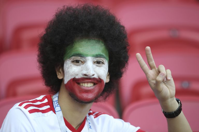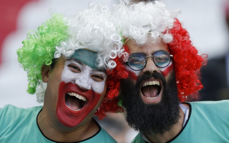Iránski fanúšikovia fandia svojmu tímu v zápase B skupiny Irán - Španielsko na MS vo futbale 2018 v Rusku, 20. júna 2018 Foto: SITA/AP