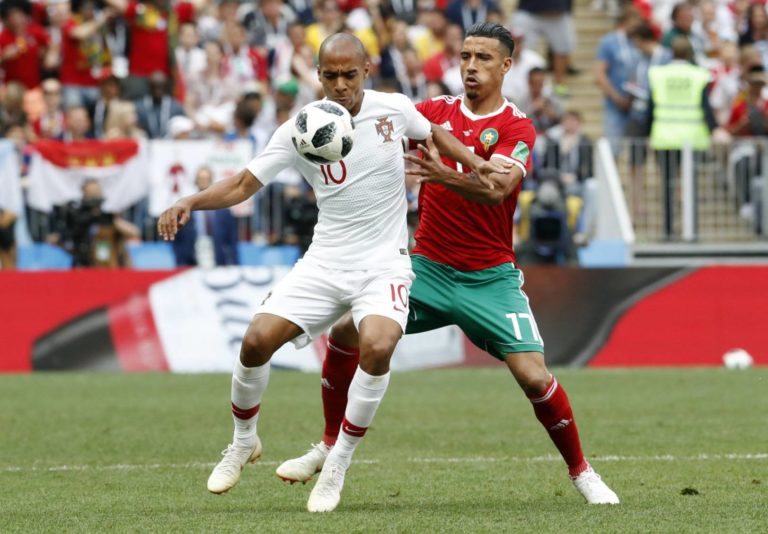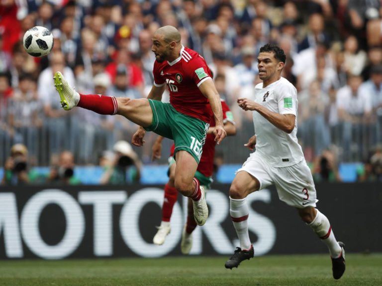 Portugalčan Pepe (biely dres) v súboji s Maročanom Noureddineom Amrabatom počas zápasu na MS vo futbale 2018 v Rusku. 20. jún 2018 Foto: SITA/AP