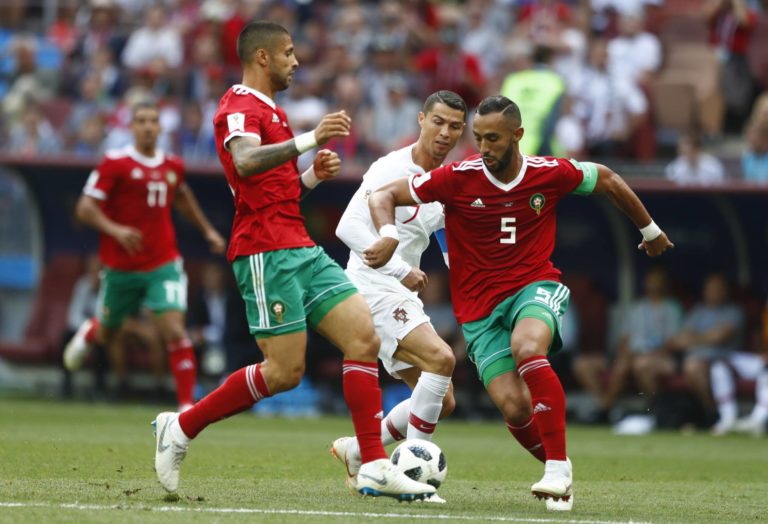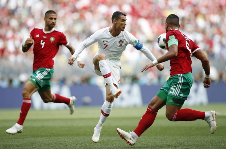 Maročania Manuel Da Costa, vľavo a Mehdi Benatia, vpravo, sa snažia zastaviť Portugalčana Cristiana Ronalda počas MS vo futbale 2018 v Rusku. 20. jún 2018 Foto: SITA/AP