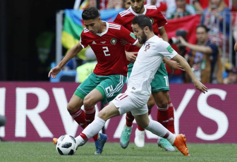Maročan Achraf Hakimi v súboji s Portugalčanom Bernardom Silvom počas zápasu na MS vo futbale 2018 v Rusku. 20. jún 2018 Foto: SITA/AP