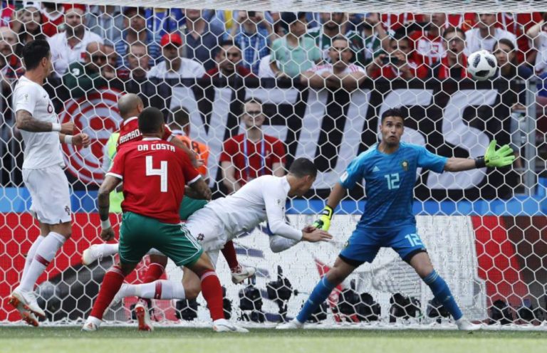 Portugalčan Cristiano Ronaldo, vstrede, strieľa svoj prvý gól v zápase proti Maroku na MS vo futbale 2018 v Rusku. 20. jpn 2018 Foto: SITA/AP