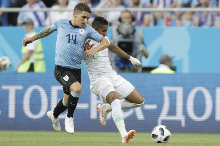 Zľava: Lucas Torreira (Uruguay) a Salem Aldawsari za tím Saudskej Arábie v súboji o loptu v zápase A skupiny na MS vo futbale 2018 v Rusku, 20. júna 2018 Foto: SITA/AP