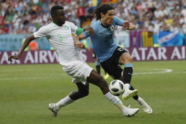 Sprava: Edinson Cavani (Uruguay) a hráč Saudskej Arábie Osama Hawsawi súperia o loptu v zápase A skupiny na MS vo futbale 2018 v Rusku, 20. júna 2018 Foto: SITA/AP