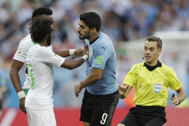 Zľava: Yasir Alshahrani a spoluhráč Ali Albulayhi (vzadu) počas menšej strkanice s uruguajským hráčom Luisom Suaerzom v zápase A skupiny na MS vo futbale 2018 v Rusku, 20. júna 2018 Foto: SITA/AP