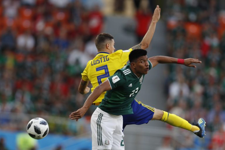 Mexičan Jesus Gallardo (vpravo) a Švéd Mikael Lustig v súboji na zápase na MS vo futbale 2018, 27. júna 2018 Foto: SITA