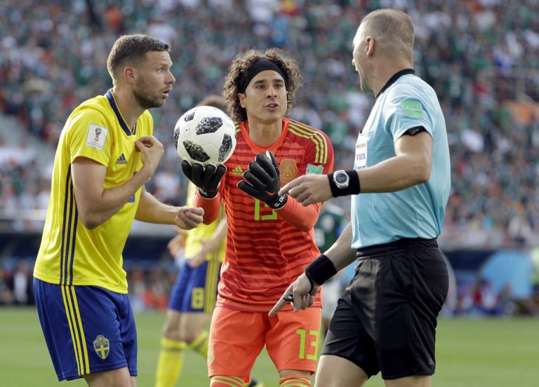 Švédsky hráč Marcus Berg (vľavo) a mexický brankár Guillermo Ochoa (v strede) argumentujú s rozhodcom v zápase na MS vo futbale 2018, 27. júna 2018 Foto: SITA/AP