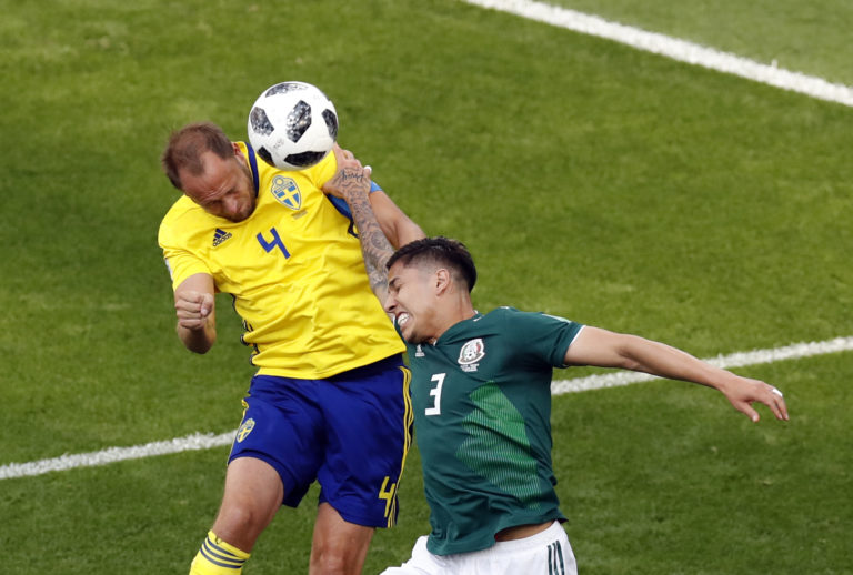 Švéd Andreas Granqvist (vľavo) v súboji o loptu s hráčom Mexika Carlos Salcedom počas zápasu na MS vo futbale 2018, 27. júna 2018 Foto: SITA/AP