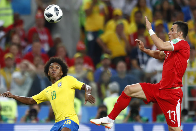Hráč Srbska Aleksandar Kolarov (vpravo) v súboji o loptu s Brazílčanom Willianom v zápase na MS vo futbale 2018, 27. júna 2018 Foto: SITA/AP