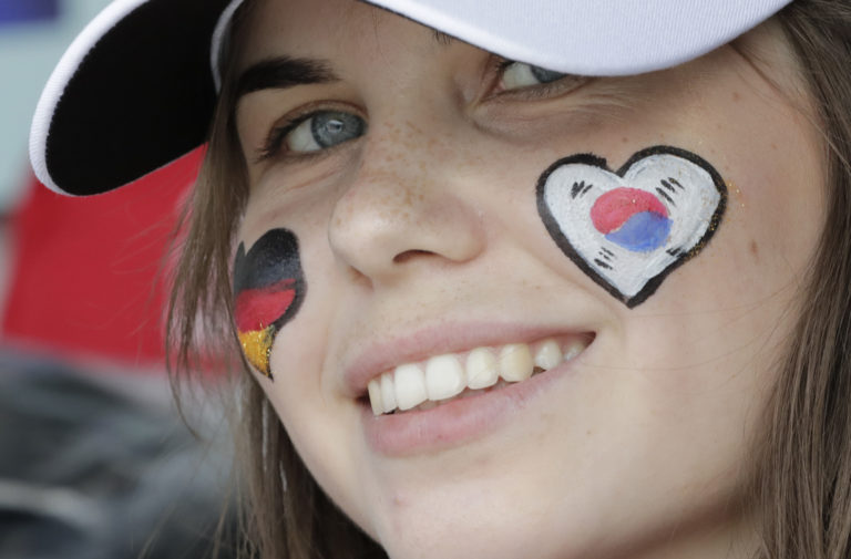 Fanúšička s maľbou tímov Južnej Kórey a Nemecka na tvári na MS vo futbale 2018, 27. júna 2018 Foto: SITA/AP