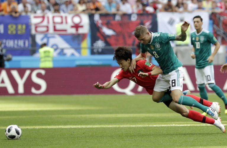 Nemec Toni Kroos (vpravo) v súboji s hráčom Južnej Kórey Lee Jae-sungom v zápase na MS vo futbale 2018, 27. júna 2018 Foto: SITA/AP