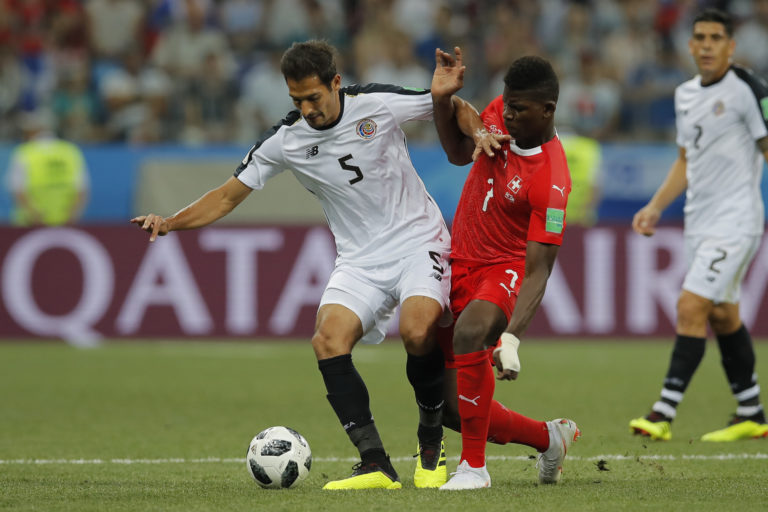 Hráč Kostariky Celso Borges (vľavo) v súboji o loptu s hráčom Švajčiarska Breel Embolom v zápase na MS vo futbale 2018, 27. júna 2018 Foto: SITA/AP