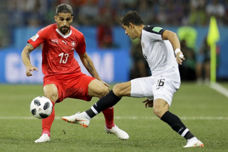 Hráč Švajčiarska Ricardo Rodrigue (vľavo) a hráč Kostariky Cristian Gamboa v súboji o loptu na zápase na MS vo futbale 2018, 27. júna 2018 Foto: SITA/AP