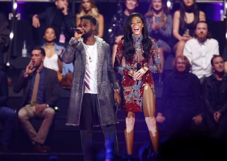 Tinie Tempah (vľavo) a Winnie Harlow počas udeľovania cien MTV Europe Music Awards. Rotterdam, 6. november 2016. Foto: SITA/AP