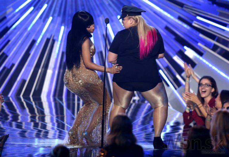 Rebel Wilson odovzdáva ocenenie Nicki Minaj za najlepší hip-hopový videoklip roka. Los Angeles, 30. augusta 2015. Foto: SITA/AP