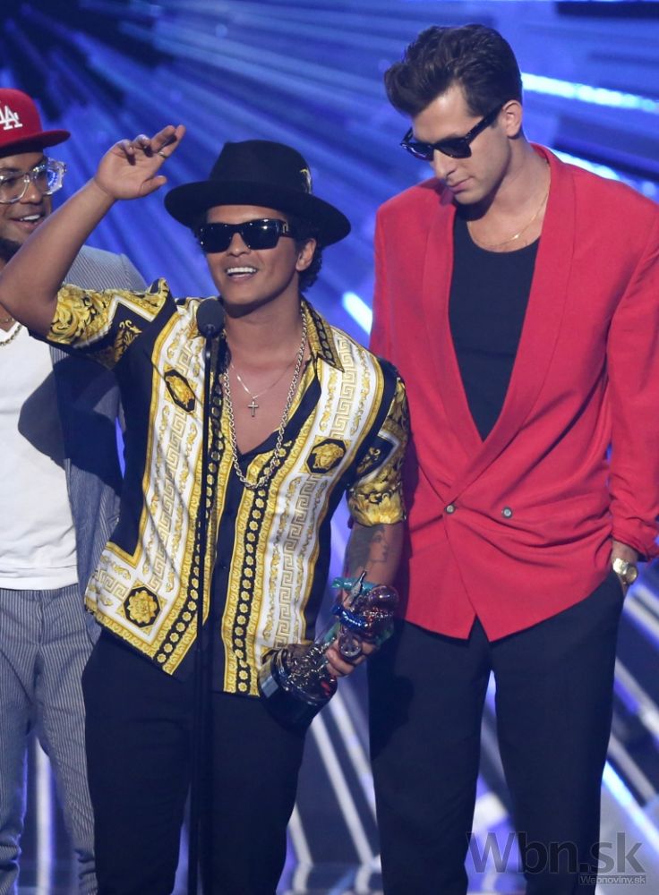 Bruno Mars, vľavo, a Mark Ronson si preberajú ocenenie za najlepší mužský videoklip roka za pieseň Uptown Funk. Los Angeles, 30. augusta 2015. Foto: SITA/AP