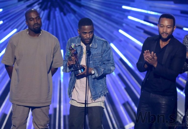 Kanye West, zľava, Big Sean, a John Legend si preberajú ocenenie v kategórii videoklip s najlepším posolstvom za pieseň One Man Can Change the World. Los Angeles, 30. augusta 2015. Foto: SITA/AP