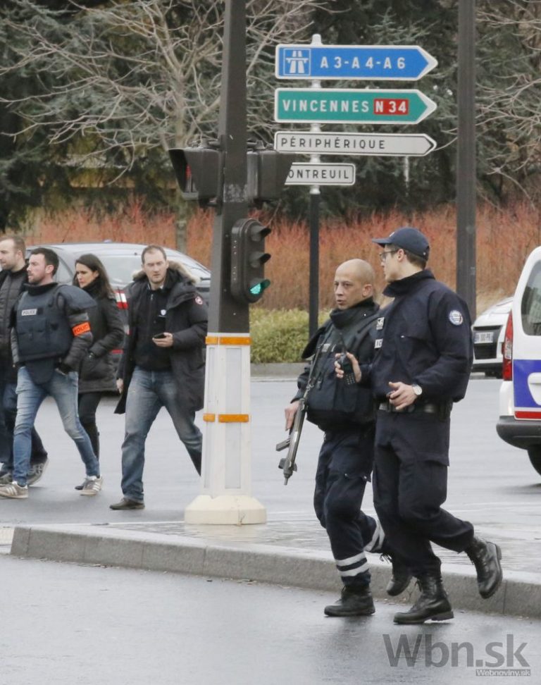 Útočník, ktorý zabil policajtku, zadržiava v obchode s lahôdkami asi päť rukojemníkov vrátane matky s dieťaťom. Polícia okolie lahôdkarstva na predmestí Porte de Vincennes uzavrela a nariadila tiež zatvorenie všetkých obchodov a reštaurácií v židovskej štvrti Le Marais z obavy ďalších útokov. Foto: SITA/AP