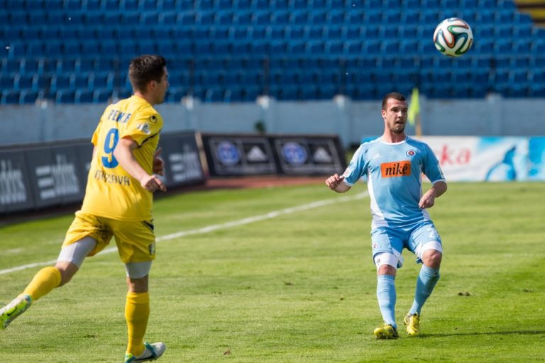 Sprava: Hráči Myjavy Frederik Bilovský a Štefan Pekár počas zápasu 26. kola Corgoň ligy 2013/14 medzi ŠK Slovan Bratislava a Spartak Myjava. Foto: SITA/Jozef Jakubčo