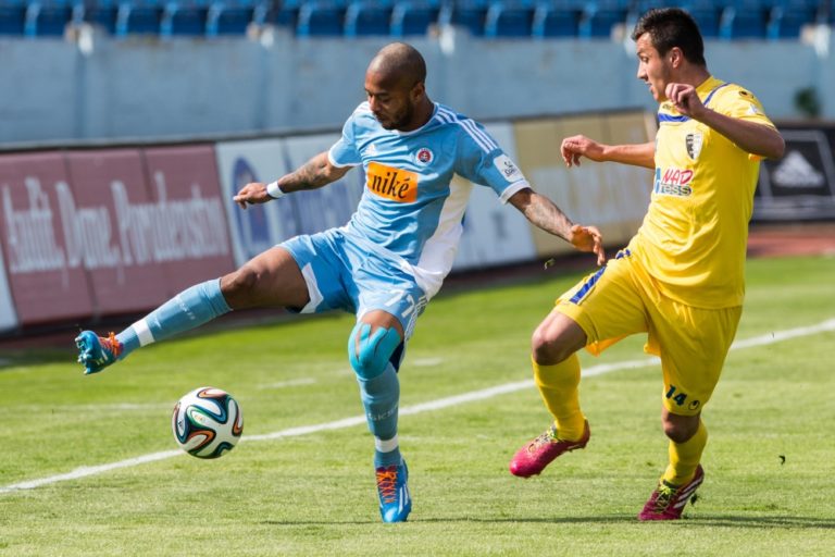 Zľava: Hráč Slovana Róbert Vittek počas zápasu 26. kola Corgoň ligy 2013/14 medzi ŠK Slovan Bratislava a Spartak Myjava. Foto: SITA/Jozef Jakubčo