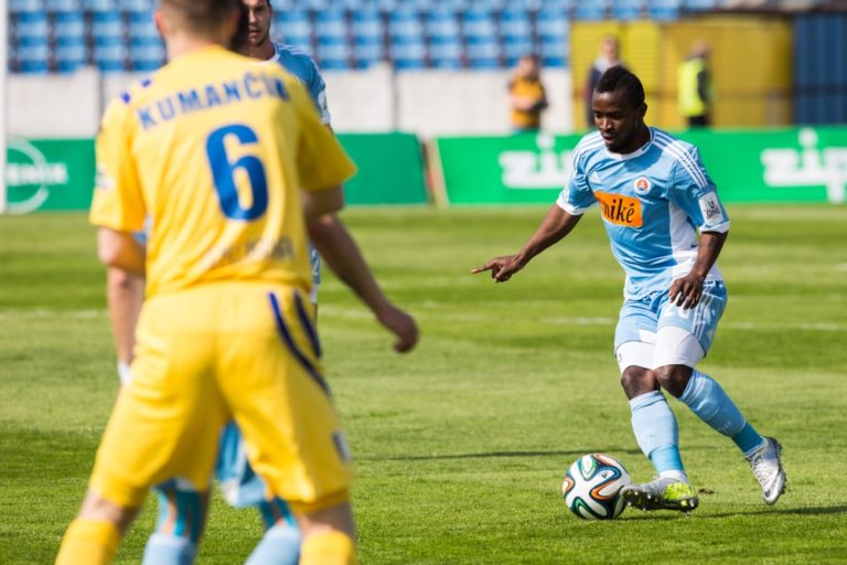 Sprava: Hráč Slovana Seydouba Soumah a hráč Myjavy Peter Kumančík počas zápasu 26. kola Corgoň ligy 2013/14 medzi ŠK Slovan Bratislava a Spartak Myjava. Foto: SITA/Jozef Jakubčo